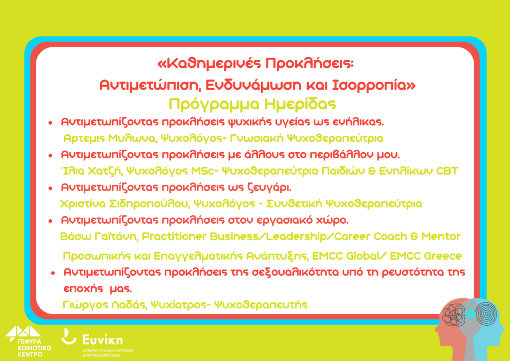 Σας προσκαλούμε στην ημερίδα «Καθημερινές Προκλήσεις: Αντιμετώπιση, Ενδυνάμωση και Ισορροπία» που διοργανώνεται από το Κοινοτικό Κέντρο «Γέφυρα» σε συνεργασία με το Κέντρο Συμβουλευτικής & Ψυχοθεραπείας «Ευνίκη».