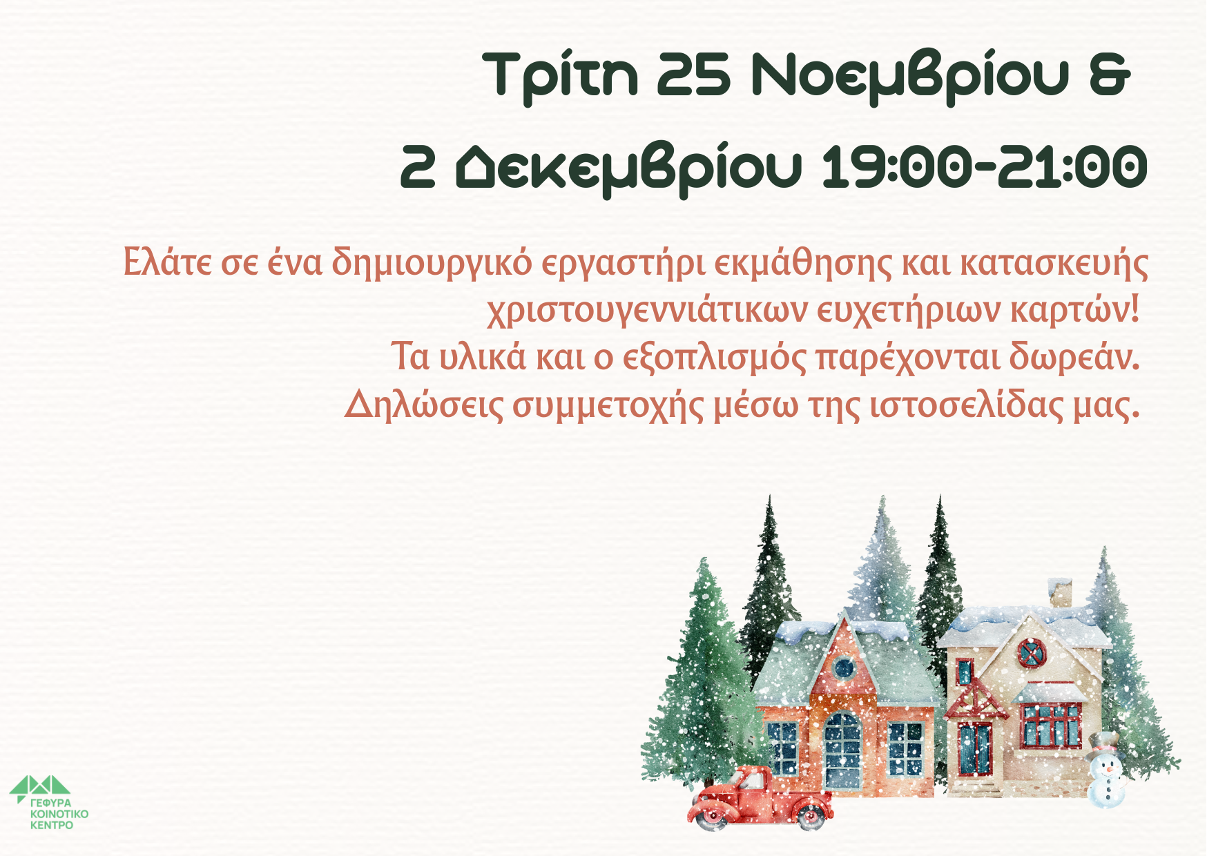 | 1 event, - ![]() Κάθε Δευτέρα 18:00-21:00 μαζευόμαστε στο Κοινοτικό Κέντρο «Γέφυρα» για επιτραπέζια. Έλα στην παρέα μας! Ρόδου 2, 15 122 Μαρούσι είσοδος ελεύθερη Δεν απαιτείται δήλωση συμμετοχής | 1 event, - ![]() Τρίτη 2 Δεκεμβρίου 2025 19:00-21:00 Ελάτε σε ένα δημιουργικό εργαστήρι εκμάθησης και κατασκευής χριστουγεννιάτικων ευχετήριων καρτών! Τα υλικά και ο εξοπλισμός παρέχονται δωρεάν. Δηλώσεις συμμετοχής μέσω της ιστοσελίδας μας. | 0 events, | 1 event, - ![]() Πέμπτες 10:30-13:00 Σε όλους μας αρέσει ο καφές και η παρέα! Έτσι, το Κοινοτικό Κέντρο «Γέφυρα» ανοίγει τον χώρο του και προσφέρει καφέ για όσους και όσες ενδιαφέρονται. Έλα μόνος/η ή με την παρέα σου! «Γέφυρα» Κοινοτικό Κέντρο, Ρόδου 2, 15122 Μαρούσι, είσοδος ελεύθερη | 0 events, | 0 events, | |